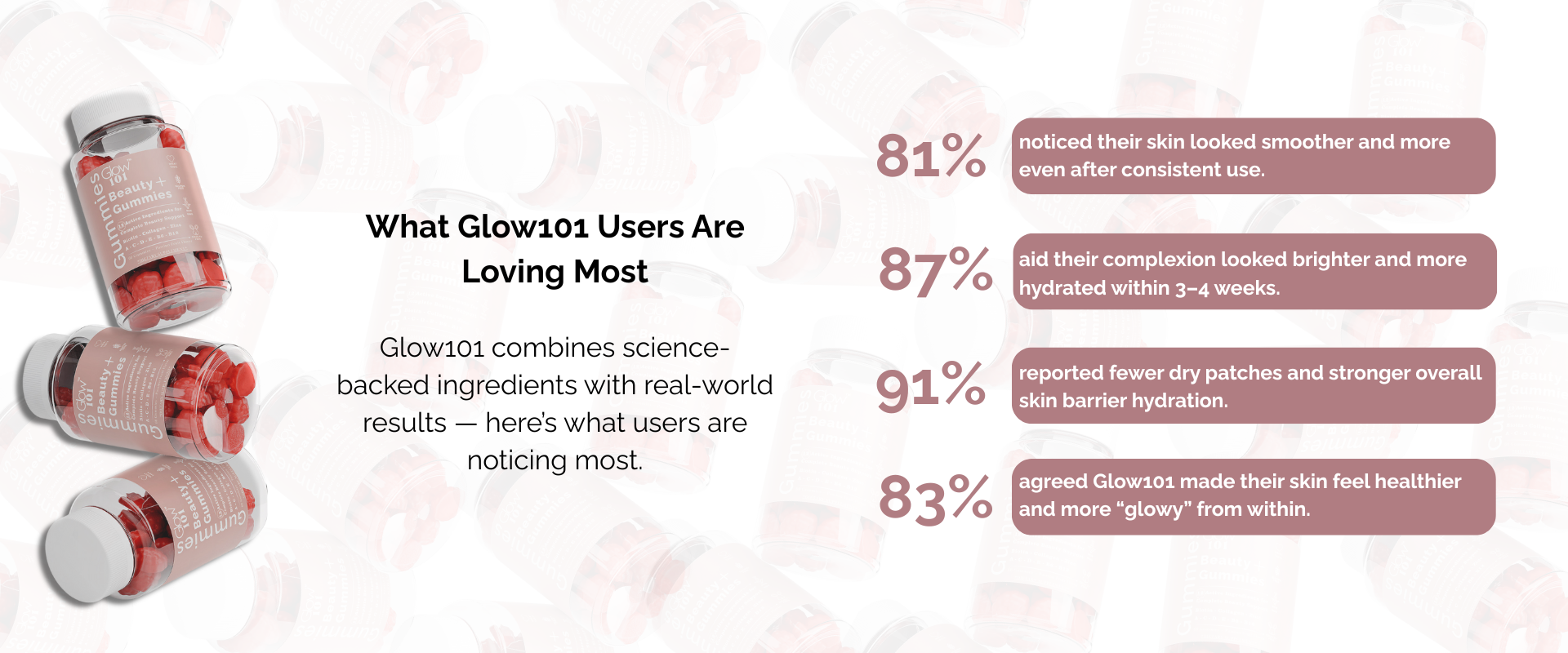 More women are joining the Glow101 routine — 2 delicious daily gummies made to support smoother texture, brighter tone, and healthier-looking skin.