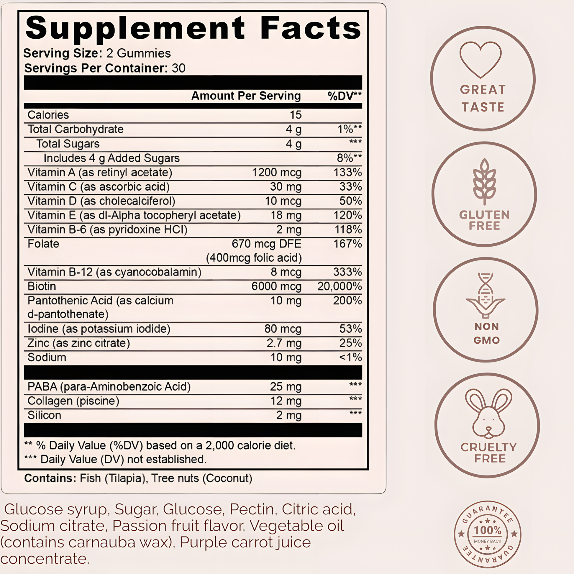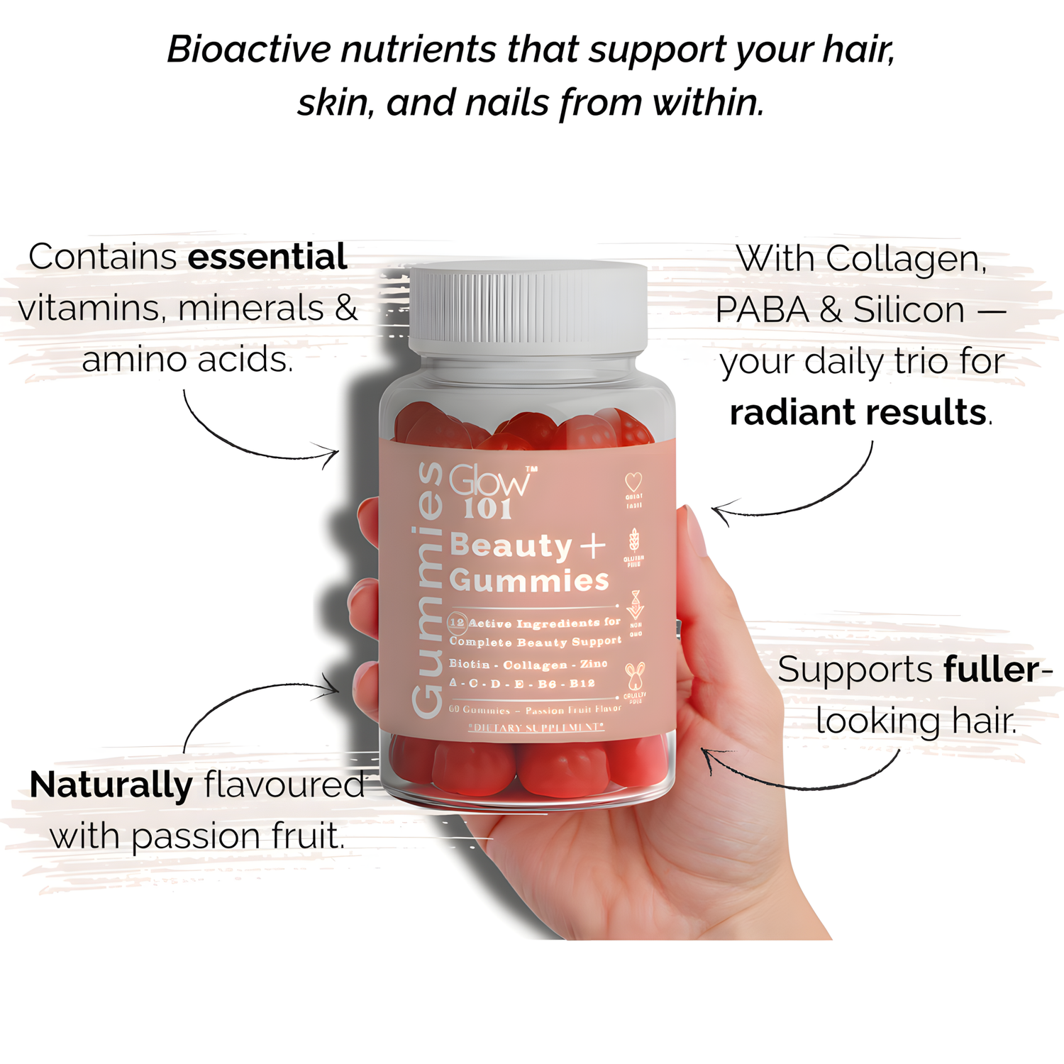 Like all supplements, your body absorbs what it needs most efficiently through digestion. Glow101 Beauty+ Gummies are formulated with bioavailable ingredients — meaning the nutrients are easy for your body to absorb and use effectively. Each gummy is designed to deliver real nourishment, not just pass through your system.