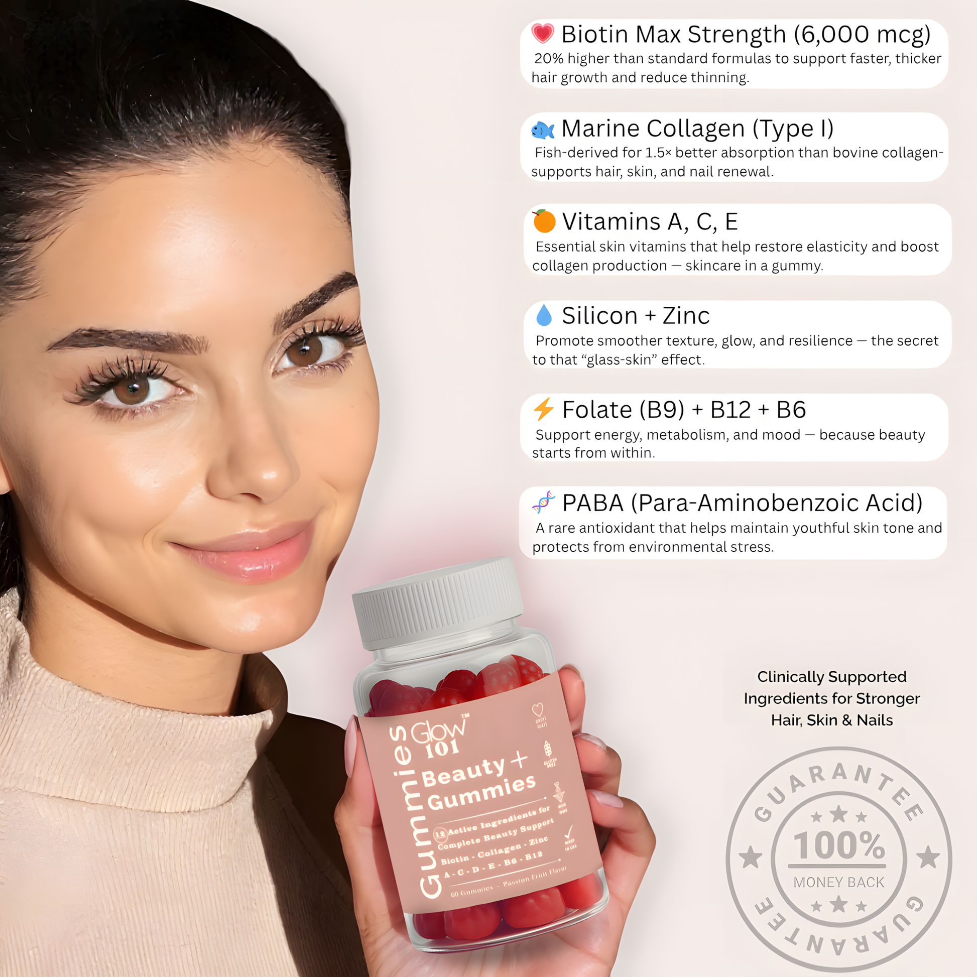More women than ever are simplifying their beauty routines with Glow101 Beauty+ Gummies — a convenient, all-in-one supplement designed to support hair, skin, and nails from within. Each gummy delivers bioactive nutrients like Collagen, Biotin, Zinc, PABA, and Silicon to help maintain a naturally healthy glow. It’s beauty made simple — no complicated routines, no harsh formulas, just results you can feel good about.