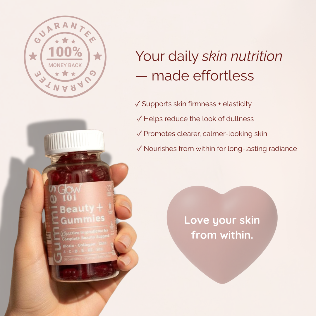 No powders. No pills. No complicated routines. Glow101 Beauty+ Gummies give your skin the nutrients it needs in seconds — a delicious daily habit for smoother texture, deeper hydration, and a healthy, natural glow.