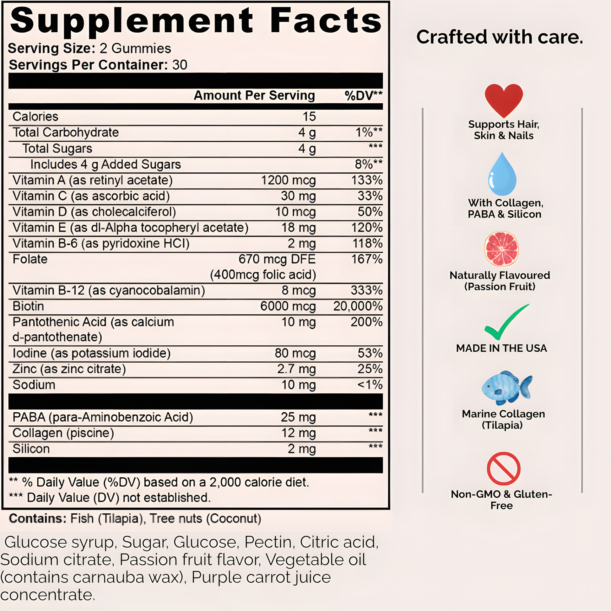Glow101 Beauty+ Gummies contain marine collagen (from tilapia) and tree nuts (coconut). They’re gluten-free, non-GMO, and made in the USA.